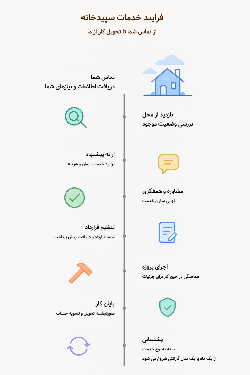 در سپیدخانه، هدف ما این است که هر پروژه با دقت، شفافیت و احترام به نیازهای سالمند و خانواده او انجام شود. ما مسیر مشخص و مرحلهبهمرحلهای برای اجرای هر پروژه داریم تا مشتری از همان ابتدا تا پایان کار، از روند انجام خدمات آگاه باشد و اطمینان داشته باشد که همه چیز مطابق انتظار او پیش میرود.